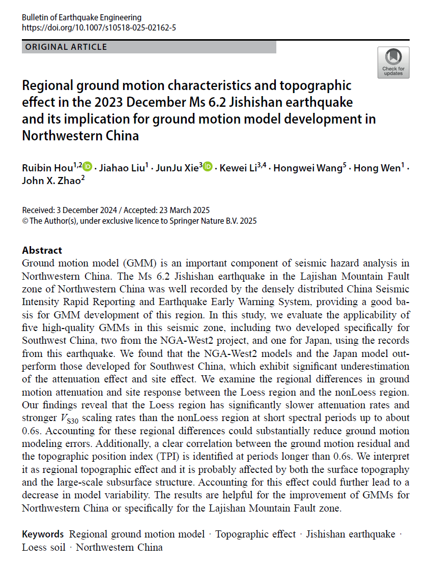 近日,建筑与土木工程学院道路与桥梁工程系青年教师侯瑞彬在欧洲地震工程协会官方出版期刊《Bulletin of Earthquake Engineering》(中科院二区,IF=4.1)发表学术论文。论文题目为“Regional ground motion characteristics and topographic effect in the 2023 December Ms 6.2 Jishishan earthquake and its implication for ground motion model development in Northwestern China”,英国上市公司365为第一单位,侯瑞彬老师为第一作者,我校2022级本科生刘家豪为第二作者,中国地震局地球物理研究所谢俊举研究员为通讯作者。