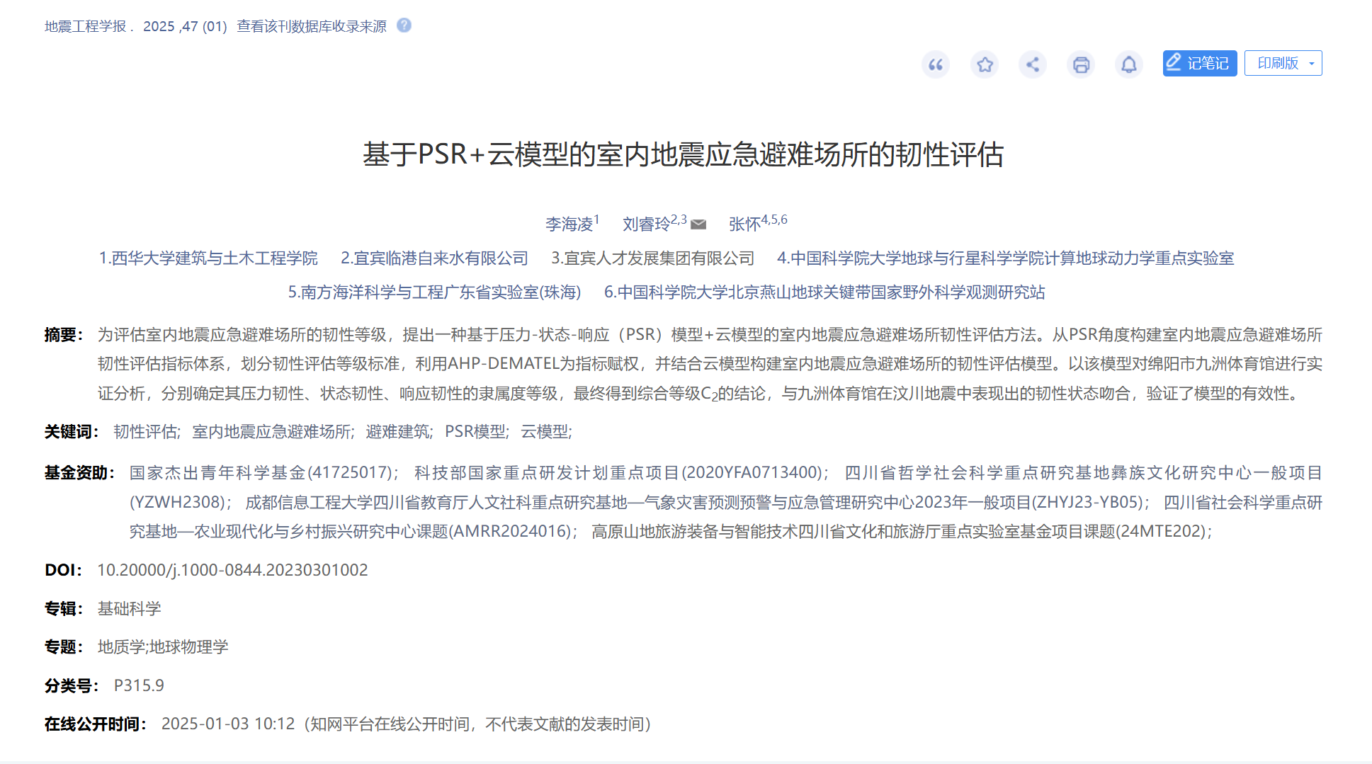 近日,建筑与土木工程学院李海凌教授团队在防灾减灾领域取得突破,其论文《基于PSR+云模型的室内地震应急避难场所的韧性评估》发表在CSCD核心期刊《地震工程学报》。该研究创新性构建了室内应急避难场所韧性评估体系,并以绵阳市九洲体育馆进行实证分析,验证了模型的有效性。