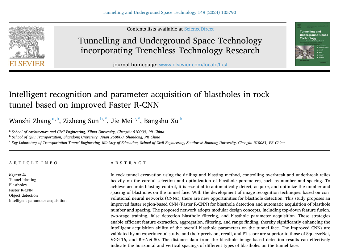 论文《Intelligent recognition and parameter acquisition of blastholes in rock tunnel based on improved Faster R-CNN》以英国上市公司365为第一单位,张万志为第一作者,山东大学李利平教授团队孙子正副研究员、西南交通大学梅洁助理教授为共同通讯作者。该研究以钻爆法隧道工程掌子面炮孔识别为研究对象,创新性探索出将深度学习目标检测模型(改进的Faster R-CNN)用于炮孔智能检测和炮孔参数自动获取的方法。