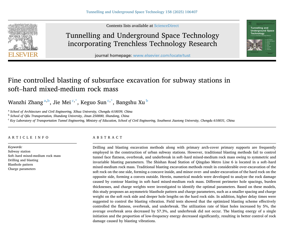 《Fine controlled blasting of subsurface excavation for subway stations in soft–hard mixed-medium rock mass》以张万志为第一作者,西南交通大学梅洁助理教授、孙克国教授担任共同通讯作者。该论文以浅埋地铁车站隧道左软右硬不均质岩体的控制爆破开挖为研究对象,探索了不对称爆破孔模式和装药参数的设计与参数优化方法。