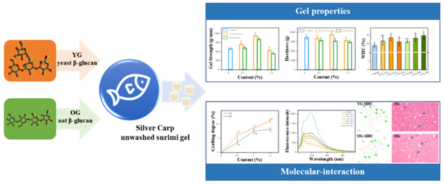 在超声辅助40 °C热处理30 min的基础上,考察不同来源的β-葡聚糖对未漂洗鱼糜品质的影响。酵母β-葡聚糖(yeast β-glucan,YG)和燕麦β-葡聚糖(oat β-glucan,OG)都能诱导肌原纤维蛋白的展开和交联,提高未漂洗鱼糜凝胶的硬度和凝胶强度。当YG和OG的添加量为1.0%时,样品凝胶强度分别比对照组提高了62.95%和45.57%。分子对接结果表明,支链结构的YG更容易通过氢键与肌球蛋白交联,且添加YG的样品分子间相互作用强于添加OG的样品,这提高了未漂洗鱼糜凝胶的物理性质和持水力。但当β-葡聚糖的添加量增加1.5%时,凝胶网络中的孔隙过度扩张,肌原纤维蛋白的连续结构逐渐被破坏,导致凝胶性能和流变性能下降。