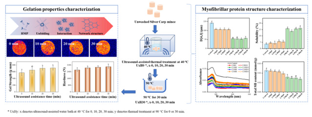 全球人口正在经历老龄化,老年人经常因咀嚼和吞咽困难而难以摄入凝胶类制品。本研究通过超声改性预热鳕鱼蛋白分子柔性,促进柔性分子自组装聚集形成网络结构,开发软质蛋白凝胶类制品。研究发现超声处理显著降低蛋白质颗粒尺寸,提高表面疏水性,促使分子柔性增加;柔性蛋白分子在冷却过程中通过自组装聚集,形成了适宜老年人等咀嚼/吞咽障碍人群食用的鳕鱼蛋白凝胶。