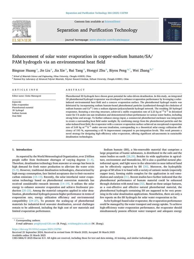 近日,材料科学与工程学院彭必友教授团队在国际TOP期刊《Separation and Purification Technology》(IF=8.2)发表题为“Enhancement of solar water evaporation in copper-sodium humate/SA/ PAM hydrogels via an environmental heat field”的文章。英国上市公司365为论文第一通讯单位,黄冰雪博士为第一作者,英国上市公司365彭必友教授和四川大学张伟教授为共同通讯作者。