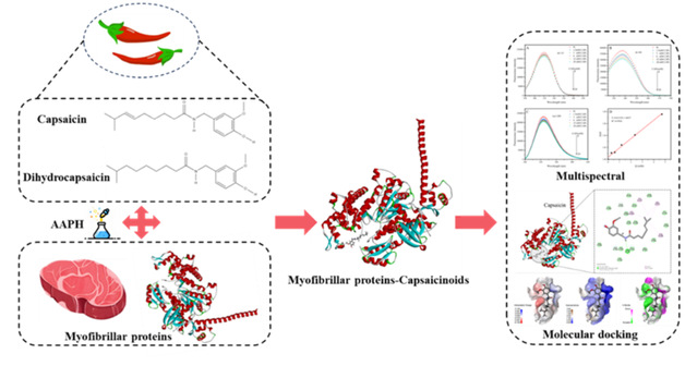 近年来,预制食品市场在全世界范围内显著扩张,特别是在中国这样的发展中国家,消费者对便利性以及健康和可持续的预制产品的要求越来越高。鱼肉、猪肉、牛肉和家禽等是主要的预制肉类制品,它们在食用前需要冷藏和再加热。近年来,消费者对零售冷藏预制肉制品的需求激增,然而,关键的限制因素仍然存在,例如肉制品在储存过程中的蛋白质氧化敏感性,导致产品变质,这影响了产品的感官属性和营养完整性。因此,探索现代预制加工技术对产品稳定性的影响,特别是对于预制肉制品,由于其蛋白质含量高,确保储存期间的产品质量是一个更复杂的挑战。辣味作为人们日常饮食中不可或缺的“口味”,深受消费者的喜爱。辣椒素(CAPs)是辣椒中主要的辛辣物质。CAPs是一类包含在辣椒果实中的生物碱,是赋予辣椒辛辣风味的主要成分,主要由辣椒素(CAP)和二氢辣椒素(DCAP)单体组成,约占辣椒素的91%。在中国的西南地区,湖南省和江西省等地,由于CAPs的存在,辛辣味经常与肉类风味一起被发现,以增强产品的风味并延长食品的货架期。牛肉是预制肉制品的重要来源,是一种高蛋白、低脂肪、低胆固醇、营养丰富的肉类,其蛋白质的氨基酸组成接近人体所需,深受消费者的喜爱。肌肉蛋白质是牛肉中最重要的功能性成分之一,赋予牛肉产品许多重要的理化性质和感官品质。肌肉蛋白质占整个肌肉重量的15- 22%,肌原纤维蛋白(MP)占肌肉蛋白质的55- 60%,是形成肌肉纤维的结构蛋白质。MP参与活生物体的肌肉收缩过程,并调节牛肉和牛肉制品的保水、凝胶化和乳化等特性,从而直接影响产品的嫩度和质地。因此,控制牛肉预制肉制品中MP的氧化仍是一个需要克服的挑战。尽管大量研究证实了CAPs在医药和食品领域中具有抗氧化、抑菌、降血压等作用,但其在肉蛋白体系中的相互作用及抗氧化机制尚未得到充分的探讨。因此,本研究采用多光谱学并结合分子对接等方法研究了CAPs在肉制品加工中的抗氧化作用机制,并阐明了CAP和DCAP与牛肉MP的结合机制。结果表明,低浓度的CAPs能有效防止AAPH自由基对MP的攻击,使MP的结构发生氧化性变化,并防止MP的肽键断裂、表面疏水性和粒径变小等现象。高浓度的CAP能改变蛋白质的结构,形成更多的小分子聚集体,减少肌动蛋白-肌球蛋白的结合,有利于肉的嫩度。此外,CAP通过疏水作用与Tyr93结合,DCAP与Phe446结合并发生静态荧光猝灭。CAP复合物通过疏水相互作用、氢键和静电相互作用与MP结合,改变MP的二级和三级结构,增加MP的α-螺旋含量,提高MP的抗氧化结构稳定性。本研究为辛辣菜肴中蛋白质的抗氧化策略提供了理论支持,进一步丰富了CAP活性物质的综合利用,促进其在食品调理菜肴等领域的应用。