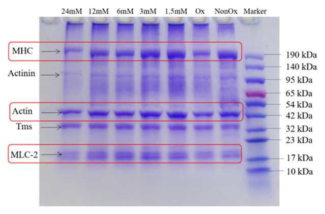 Figure 1.Electrophoretic reduction of MPs with different concentrations of CAPs under AAPH oxidation system (MHC:myosin heavy chain; Actinin: coactin;Actin:actin;Tms:pro-myosin;MLC-2:myosin light chain-2)