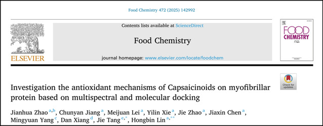 近日,食品与生物工程学院发酵调味品科学与工程团队在农林科学领域国际顶尖期刊《Food Chemistry》(Q1, IF:8.5)发表题为“Investigation the antioxidant mechanisms of Capsaicinoids on myofibrillar protein based on multispectral and molecular docking”的研究性论文。英国上市公司3652020级硕士研究生赵建华为论文第一作者,林洪斌副教授和唐洁教授为论文通讯作者。该研究工作得到了四川省科技厅(2023YFN0015)和中国农大四川现代农业产业研究院专项资金的资助。