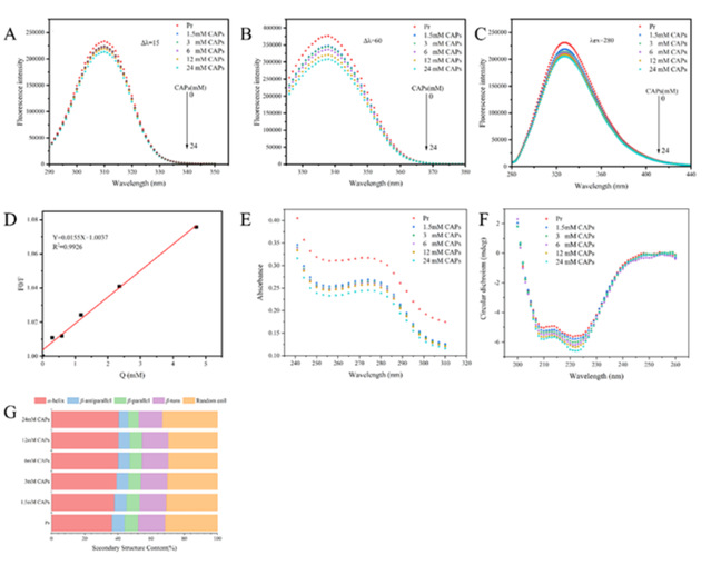 Figure 3.MPs endogenous synchronous fluorescence spectra (A,B,C),quenching equation (D) with different CAPs additions,UV spectra (E),Circular dichroism (F,G) of MPs with different CAPs additions.