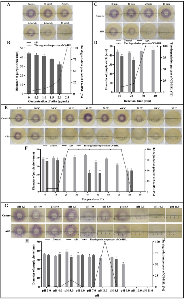 图2 浓度(A)、反应时间(C)、温度(E)和pH (G)对AiiA酶活性的影响。(B)、(D)、(F)、(H)分别为CV026报告平板上紫色圆圈直径的定量分析。