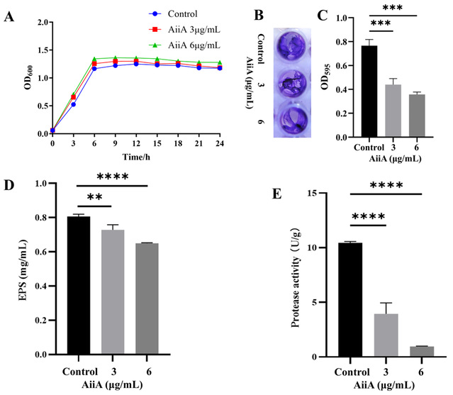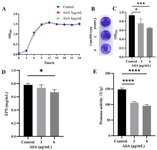 图4 AiiA对浮游和生物膜态肠杆菌的影响。(A)肠杆菌的生长曲线;结晶紫法对肠杆菌生物膜形成的定性(B)和定量(C)分析;(D)肠杆菌生物膜胞外多糖含量;(E)肠杆菌胞外蛋白酶活性。