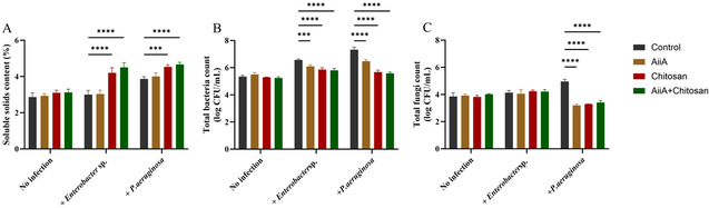 图6 AiiA和壳聚糖处理对感染或未感染草莓可溶性固形物含量(A)、细菌总数(B)和真菌总数(C)的影响。
