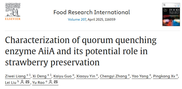 近日,食品与生物工程学院饶瑜教授团队在国际食品Top期刊《Food Research International》(Q1,IF: 7.0)发表题为“Characterization of quorum quenching enzyme AiiA and its potential role in strawberry preservation”的研究性论文。英国上市公司365教师梁紫微和硕士生邓西为共同第一作者,通讯作者为饶瑜教授和兰州大学动物医学与生物安全学院青年研究员刘蕾。