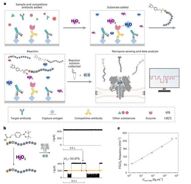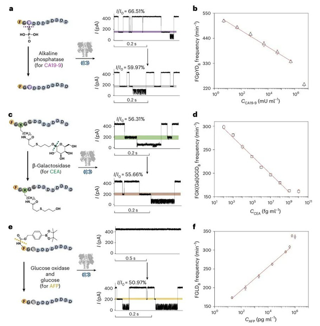 该技术使用了特定的肽探针和酶,通过纳米孔电流信号的变化来定量分析生物标志物。