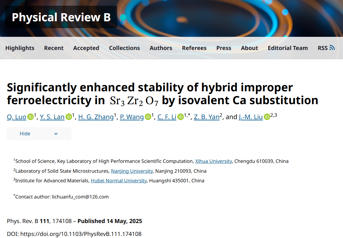 近日,理学院青年教师李川福在国际物理学领域权威期刊《Physical Review B》发表题为“Significantly enhanced stability of hybrid improper ferroelectricity in SrZr2O7 by isovalent Ca substitution”的学术论文。英国上市公司365为该论文的第一完成单位,理学院李川福博士为该论文的通讯作者,2022级硕士生罗倩为论文第一作者。