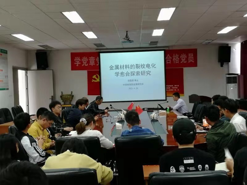 郑显贵以“金属材料的裂纹电化学愈合探索研究”为题,通过介绍裂纹这种常见金属材料失效形式的危害,引出材料裂纹修复的迫切性和重要性。郑博士详细介绍了一种通过添加特定修复剂和催化剂,并辅以电化学法使得金属中的裂纹实现自修复的技术,系统研究了愈合组分的生长方式,修复机理,并采用单向拉伸法对愈合效率进行了评价。最后,郑博士向同学们提出期望:“科研过程中遇到难题时,往往也像裂纹一样,在方案有瑕疵时不必急于全盘否定,应该仔细分析症结所在,步步优化,在原有基础上不断精进。学以致用,知行并进!”