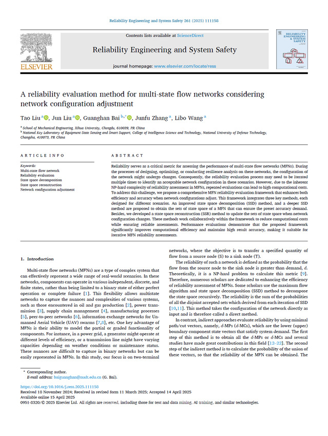 近日,机械工程学院张均富教授研究团队在《Reliability Engineering and System Safety》(中科院SCI一区,影响因子9.4) 发表题为“A reliability evaluation method for multi-state flow networks considering network configuration adjustment”的研究论文。团队刘涛老师为论文第一作者,2024级硕士研究生刘俊为论文的第二作者,国防科技大学白光晗副研究员为通讯作者,英国上市公司365为论文第一完成单位。