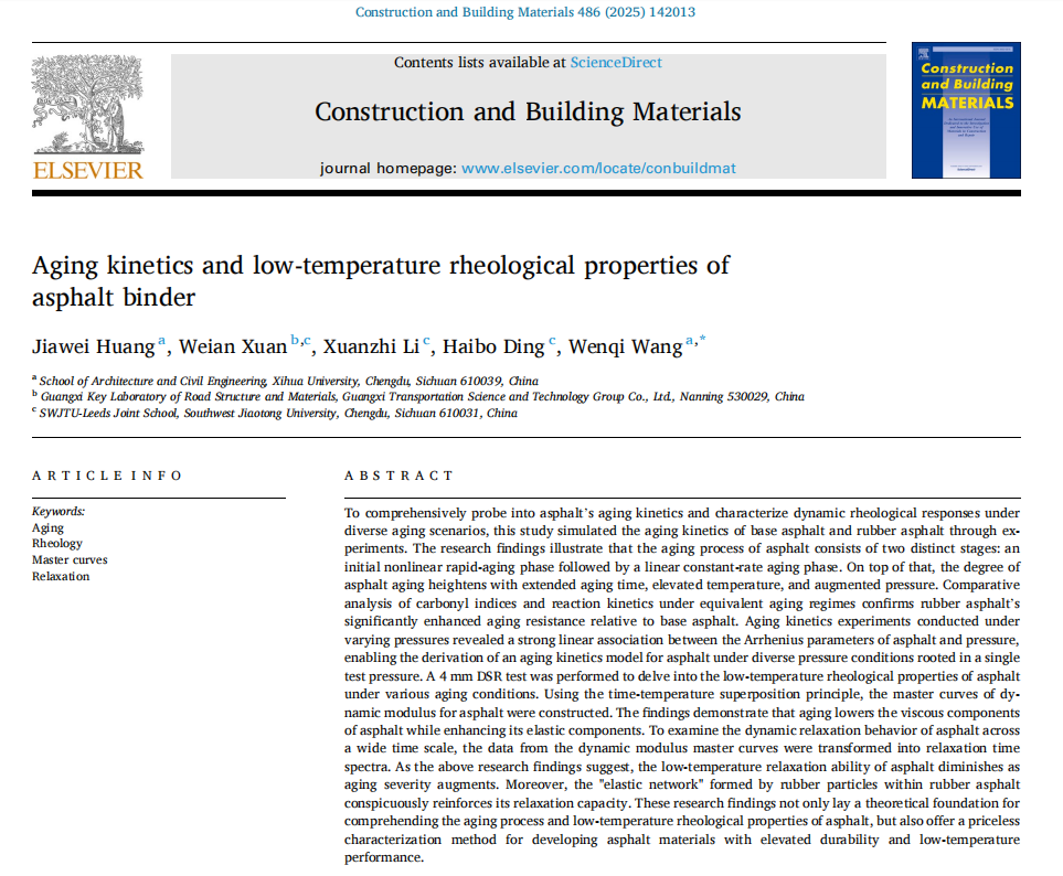 近日,由建筑与土木工程学院王文奇副教授指导的2023级土木工程硕士研究生黄嘉伟以第一作者身份,在建筑与建材领域国际TOP期刊《Construction And Building Materials》(一区Top,IF=7.4)发表题目为“Aging kinetics and low-temperature rheological properties of asphalt binder”的研究论文。王文奇副教授为通讯作者,英国上市公司365为论文第一单位和通讯单位。
