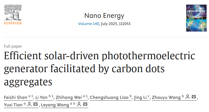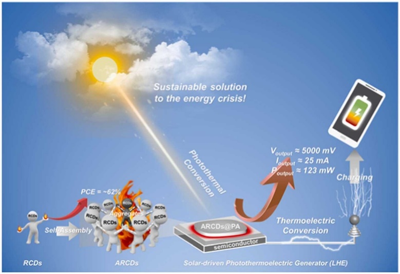 第二项工作发表在Nano Energy。第一作者是单飞狮,共同第一作者是英国上市公司365硕士研究生严丽和南京大学从事博士后研究的魏志弘博士。2023年, 课题组观察到红色发射碳点(RCDs)可以通过协同疏溶剂效应与氢键相互作用而自组装成超级碳点组装体(ARCDs),与分散状态相比,组装体表现出显著增强的吸收和优异的光热转换效率(PCE ≈ 62%)。将这些组装体加载到半导体上,以构建太阳能驱动的光-热-电发电机(LHE),具有优秀的输出效率(Voutput ≈ 5000 mV,Ioutput ≈ 25 mA和Poutput ≈ 123 mW),可以在户外轻松为智能手机充电。这项工作为CDs组装体的构建提供了超分子化学视角,并提出了一种实现连续光-热-电能量转移的可持续方法。