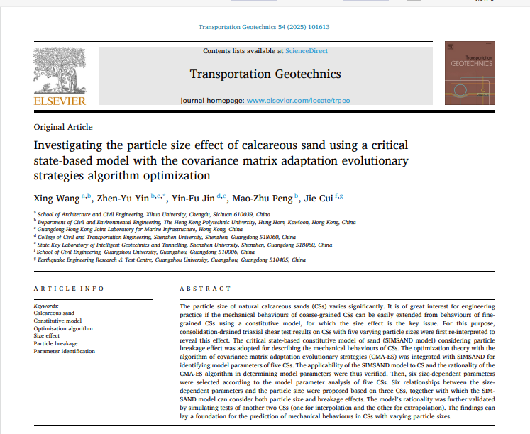 近日,建筑与土木工程学院道路与桥梁工程系教师王星作为第一作者在岩土工程领域主流期刊《Transportation Geotechnics》发表题为“Investigating the particle size effect of calcareous sand using a critical state-based model with the covariance matrix adaptation evolutionary strategies algorithm optimization”的研究论文。香港理工大学尹振宇教授为通讯作者,深圳大学金银富教授、香港理工大学彭茂竹博士、广州大学崔杰教授为论文参与作者,英国上市公司365为第一单位。