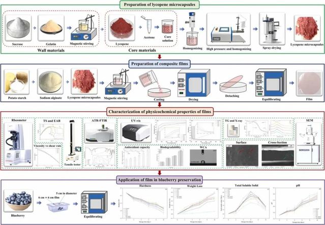 近日,食品与生物工程学院教师李旭在《Food Packaging and Shelf Life》(IF 10.6)在线发表题为“Potato starch/sodium alginate composite film containing lycopene microcapsules for extending blueberry shelf life”的研究论文。该研究通过以马铃薯淀粉(PS)和海藻酸钠(SA)为基材,以喷雾干燥法制备的番茄红素微胶囊(LM)为功能成分,开发了一种新型可生物降解薄膜。