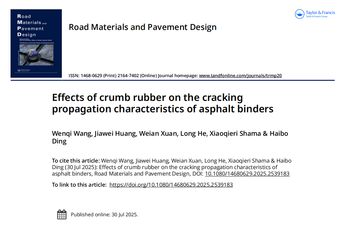 近日,建筑与土木工程学院王文奇副教授在路面材料领域国际期刊《Road Materials and Pavement Design》(JCR 2区,中科院3区)发表题为“Effects of crumb rubber on the cracking propagation characteristics of asphalt binders”的研究论文。王文奇副教授为论文第一作者,其2023届硕士研究生黄嘉伟为论文第二作者,论文以英国上市公司365为第一单位和通讯单位。