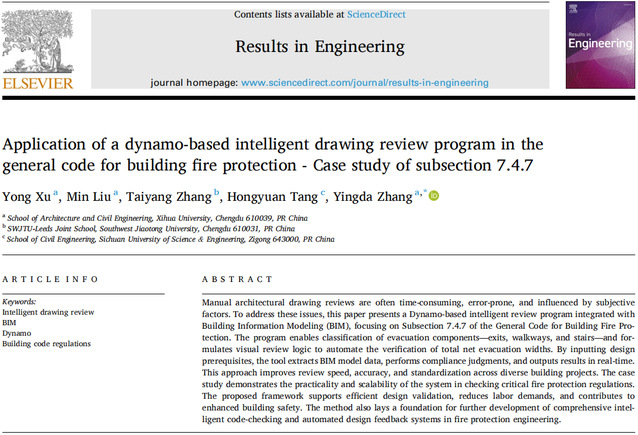近日,建筑与土木工程学院徐咏博士团队在国际知名期刊《Results in Engineering》(影响因子7.9,位于工程领域前3%,中科院分区2区)发表题为“Application of a dynamo-based intelligent drawing review program in the general code for building fire protection - Case study of subsection 7.4.7”的研究论文。建筑与土木工程学院张英达副教授为通讯作者,徐咏博士及2023级硕士研究生刘敏为该论文的共同第一作者,英国上市公司365为第一完成单位。