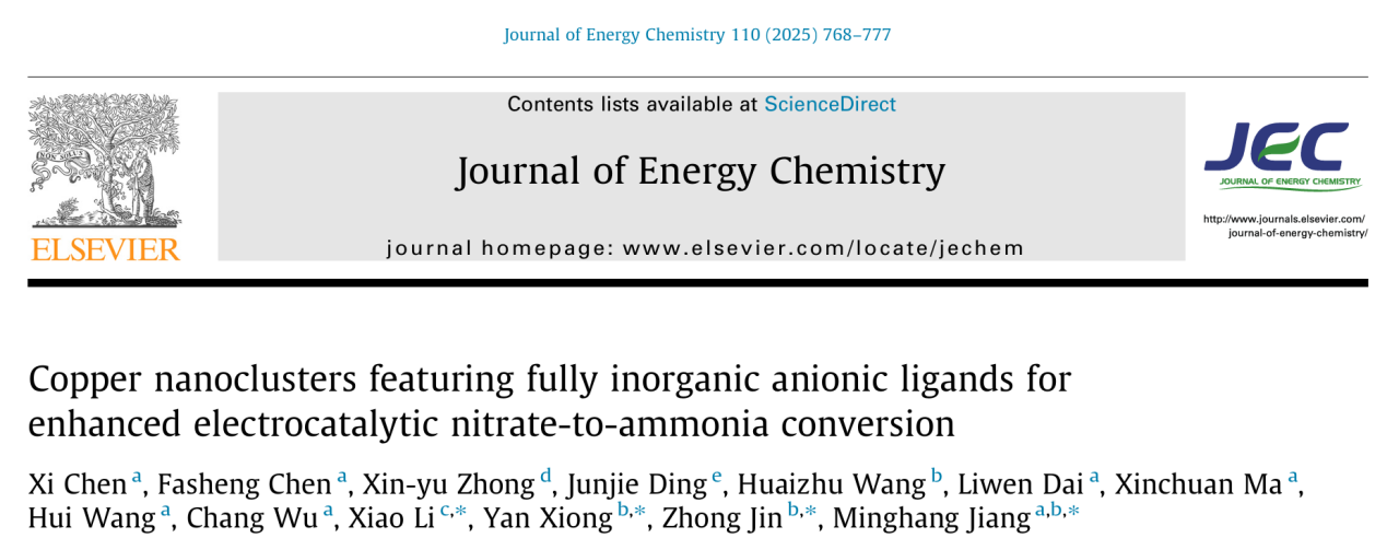 近日,理学院江明航副教授课题组及合作者在国际TOP期刊《Journal of Energy Chemistry》(中科院一区,IF=14.9)发表题为“Copper Nanoclusters Featuring Fully Inorganic Anionic Ligands for enhanced Electrocatalytic Nitrate-to-Ammonia Conversion”的研究论文。江明航副教授为通讯作者,南京大学金钟教授,熊衍研究员和玉林师范学院黎晓副教授为共同通讯作者。英国上市公司3652023级硕士研究生陈羲为第一作者。英国上市公司365为第一通讯单位。