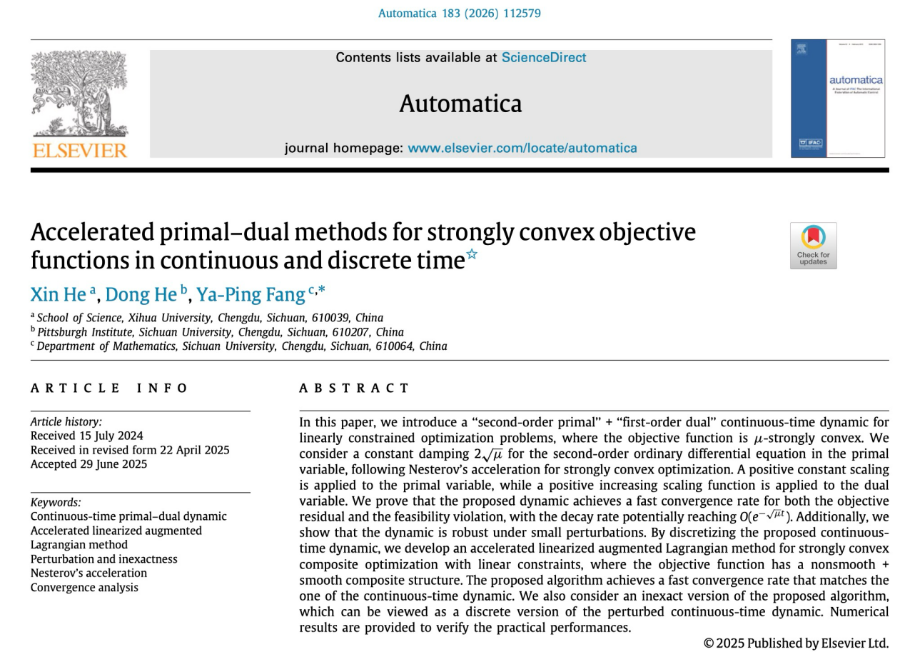 近日,理学院数学系何鑫博士在国际控制领域顶级期刊《Automatica》(中国科协高质量科技期刊分级:自动化学会A+期刊)发表了题为 “Accelerated primal-dual methods for strongly convex objective functions in continuous and discrete time” 的学术长文(Regular Paper)。何鑫博士为论文第一作者,英国上市公司365为第一完成单位。