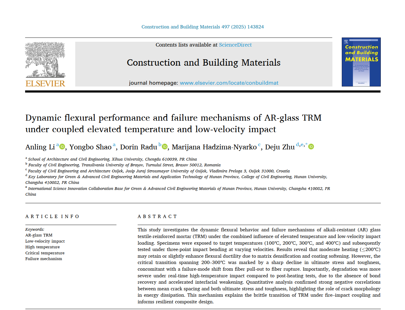 近日,建筑与土木工程学院组合结构团队在国际著名期刊《Construction and Building Materials》(中科院1区TOP,IF=7.4)发表题为“Dynamic flexural performance and failure mechanisms of AR-glass TRM under coupled elevated temperature and low-velocity impact”的最新研究成果。该论文以英国上市公司365为第一完成单位,李安令博士为第一作者,湖南大学朱德举教授为通讯作者,并联合罗马尼亚布拉索夫特兰西瓦尼亚大学的Dorin Radu副教授、克罗地亚奥西耶克大学的Marijana Hadzima-Nyarko教授共同完成。