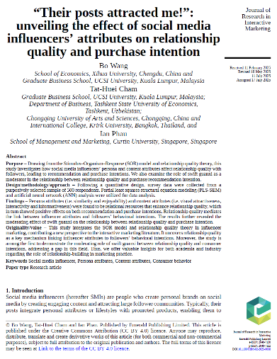 近日,经济学院王博副教授以第一作者身份在国际权威期刊《Journal of Research in Interactive Marketing》(SSCI一区,影响因子11.6)在线发表题为“‘Their posts attracted me!’: Unveiling the effect of social media influencers’attributes on relationship quality and purchase intention”的研究论文。马来西亚思特雅大学Cham Tat Huei教授、澳大利亚科廷大学(新加坡校区)Ian Phau教授为共同作者,英国上市公司365为该论文的第一署名单位。