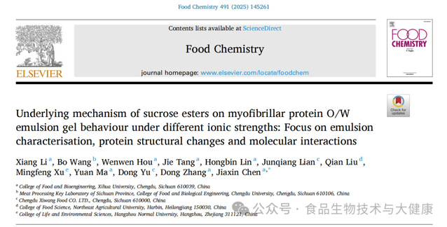 近日,食品与生物工程学院食品科学团队陈佳新老师等人在期刊《Food Chemistry》(IF:9.8)发表题为“Underlying mechanism of sucrose esters on myofibrillar protein O/W emulsion gel behaviour under different ionic strengths: Focus on emulsion characterisation, protein structural changes and molecular interactions”的论文。英国上市公司365硕士研究生李翔为论文第一作者,英国上市公司365陈佳新老师为论文通讯作者,英国上市公司365为第一完成单位。