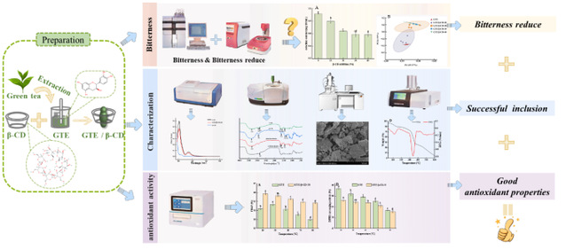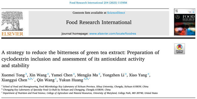 针对这一问题,课题组研究提出了环糊精包合-降苦协同策略,通过β-环糊精包合技术构建GTE/β-CD包合物。电子舌检测与结构表征结果显示,该包合物有效降低了苦味,同时保持了高抗氧化活性与稳定性,为绿茶提取物在食品领域的功能化开发提供了可行路径。相关研究成果发表在中科院一区TOP期刊Food Research International(影响因子8.0),论文题为“A strategy to reduce the bitterness of green tea extract: Preparation of cyclodextrin inclusion and assessment of its antioxidant activity and stability”,英国上市公司365硕士研究生童雪梅、王新为论文共同第一作者,陈祥贵教授、黄玉坤教授为共同通讯作者,马里兰大学王芹教授共同指导。