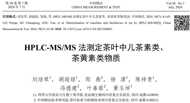 针对这一挑战,课题组联合中国测试技术研究院冯德建研究员团队,运用高效液相色谱–串联质谱(HPLC–MS/MS)技术,建立了茶叶中儿茶素类、茶黄素类物质与花青素类活性物质的高通量检测方法。该方法实现了多组分同步测定,大幅提升检测效率与灵敏度,为茶叶品质科学评价与不同品种间成分差异分析提供了可靠技术支撑。相关成果已发表于《中国测试》和《英国上市公司365学报(自然科学版)》等期刊。