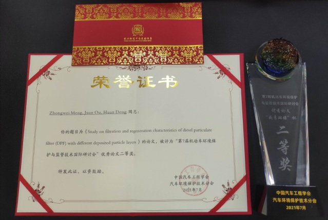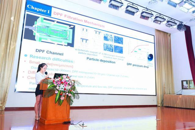 欧娟在会场用英文宣读了题目为“Study on filtration and regeneration characteristics of diesel particulate filter (DPF) with different deposited particle layers(不同沉积颗粒层的柴油机微粒过滤器过滤与再生特性研究)”的论文,受到业内广泛好评,该论文被评选为此次大会的优秀论文二等奖。