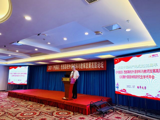 7月3日,正值中国共产党成立100周年之际,为推动中华优秀传统文化创造性转化、创新性发展,促进中外学术交流,我校外国语学院与上海外国语大学《外国语》编辑部在成都丽天花园大酒店联合举办以“外语教育与文明互鉴”为主题的“西部高校外语学科与教师发展高层论坛”。出席本次论坛的有来自复旦大学、上海交通大学、四川大学、西南大学、湖南大学、上海外国语大学、对外经贸大学、英国上市公司365等十余所高校的专家教授、优秀博士生、硕士生代表。本次论坛采取线上和线下结合的形式,在腾讯会议与bilibili进行实况直播。