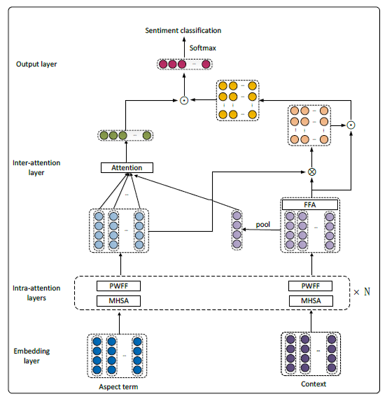 该文提出了一种新型的多注意力机制相结合的方面级情感分析算法。该算法在初始化词向量的时候采用了提高的BERT。然后提出了层内注意力机制和层间注意力机制两种不同类型的注意力机制。层内注意力机制是一个堆叠式结构,由多头自注意力机制以及点式前馈神经网络两部分构成,层间注意力机制使用一个交互式全局注意力结构。在此基础上,该文提出了一个特征关注机制模块帮助模型捕捉上下文信息。在常用的五个数据集上,实验结果表明提出模型优于同类的情感分析模型。该文具有重要的学术价值与应用前景。