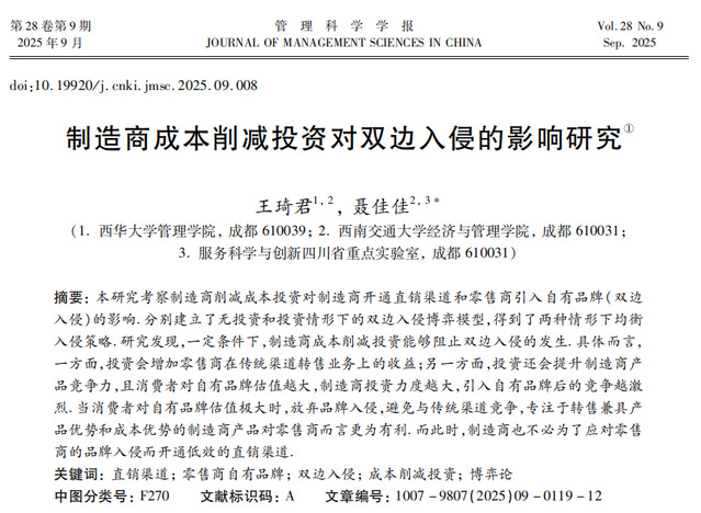 近日,管理学院王琦君博士在权威期刊《管理科学学报》发表题为“制造商成本削减投资对双边入侵的影响研究”的论文。该期刊是由国家自然科学基金委员会管理科学部与天津大学共同主办的管理科学领域学术刊物。王琦君老师为论文第一作者,西南交通大学聂佳佳教授为共同作者。