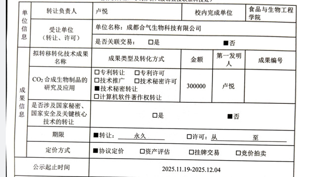 关于一项《CO2合成生物制品的研究及应用》技术秘密转让的公示