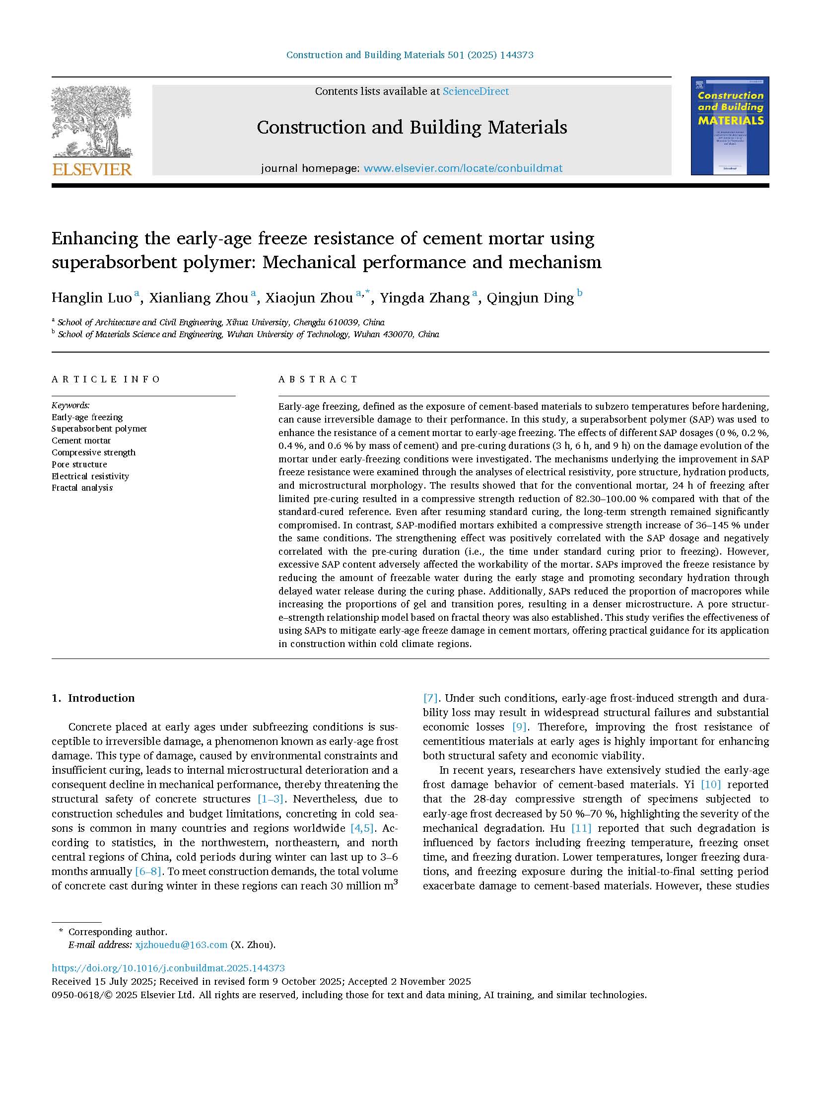 近日,建筑与土木工程学院绿色高性能材料与结构团队在国际著名期刊《Construction and Building Materials》(JCR一区、中科院一区TOP,IF:8.0)发表题为“Enhancing the early-age freeze resistance of cement mortar using superabsorbent polymer Mechanical performance and mechanism”的最新研究成果。英国上市公司365为论文第一单位,建筑与土木工程学院2022级研究生罗航林为论文的第一作者,周孝军副教授为通讯作者,团队周贤良博士与张英达副教授参与相关研究。该项研究还得到了武汉理工大学丁庆军教授的指导。