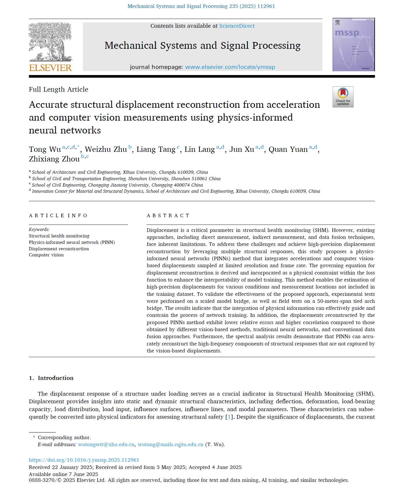 近日,建筑与土木工程学院材料与结构动力学创新研究团队在工程领域TOP期刊《Mechanical Systems and Signal Processing》(中科院一区TOP,IF=8.9)发表题为“Accurate structural displacement reconstruction from acceleration and computer vision measurements using physics-informed neural networks”的研究论文。英国上市公司365为论文第一单位,建筑与土木工程学院吴桐博士为第一作者和通信作者,团队的郎林副教授、徐军博士和袁权副教授为参与作者。