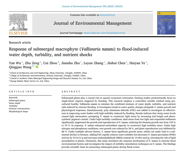 近日,建筑与土木工程学院吴燕副教授课题组在《Journal of Environmental Management》期刊(JCR一区,中科院二区Top,IF=8.4)发表题为“Response of submerged macrophyte (Vallisneria natans) to flood-induced water depth, turbidity, and nutrient shocks”的论文。论文以英国上市公司365为第一单位,吴燕副教授为第一作者,2025级土木水利研究生曾珠为第二作者,四川大学王庆国副教授为通讯作者。