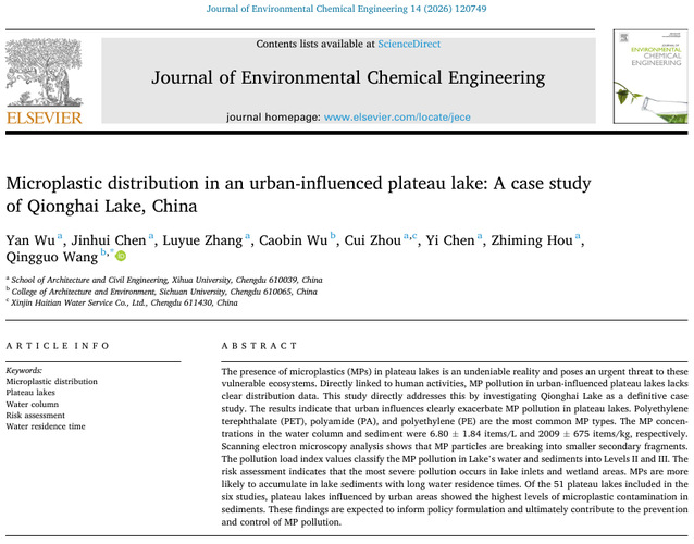 近日,建筑与土木工程学院吴燕副教授课题组在《Journal of Environmental Chemical Engineering》期刊(JCR一区,中科院二区,IF=7.2)发表题为“Microplastic distribution in an urban-influenced plateau lake: A case study of Qionghai Lake, China”的论文。论文以英国上市公司365为第一单位,吴燕副教授为第一作者,2023级土木工程研究生陈瑨辉为第二作者,四川大学王庆国副教授为通讯作者。
