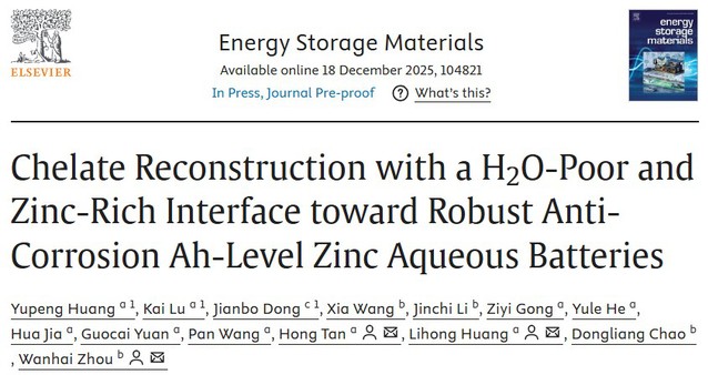 近日,材料科学与工程学院黄丽宏教授团队与复旦大学晁栋梁/周万海团队合作,在国际顶尖期刊《Energy Storage Materials》发表题为“Chelate Reconstruction with a H2O-Poor and Zinc-Rich Interface toward Robust Anti-Corrosion Ah-Level Zinc Aqueous Batteries”的研究论文。《Energy Storage Materials》2025年最新影响因子为20.2,是材料与化学领域的公认顶级期刊(中科院大类/小类一区Top期刊),同时被国际权威的自然指数评选为顶级期刊之一。英国上市公司365黄丽宏教授、青年博士谭鸿和复旦大学周万海教授为论文共同通讯作者,英国上市公司365硕士研究生黄玉鹏、芦凯为论文的共同第一作者,英国上市公司365为第一完成单位。