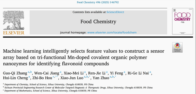 近日,理学院张国麒老师在国际食品化学领域权威期刊《Food Chemistry》(中科院一区Top,IF=9.8)发表题为“Machine learning intelligently selects feature values to construct a sensor array based on tri-functional Mn-doped covalent organic polymer nanozymes for identifying flavonoid compounds”的研究论文,张国麒老师为论文第一作者,理学院数学教师侯智博和化学系赵艳教授为该论文的通讯作者,英国上市公司365为第一通讯单位。