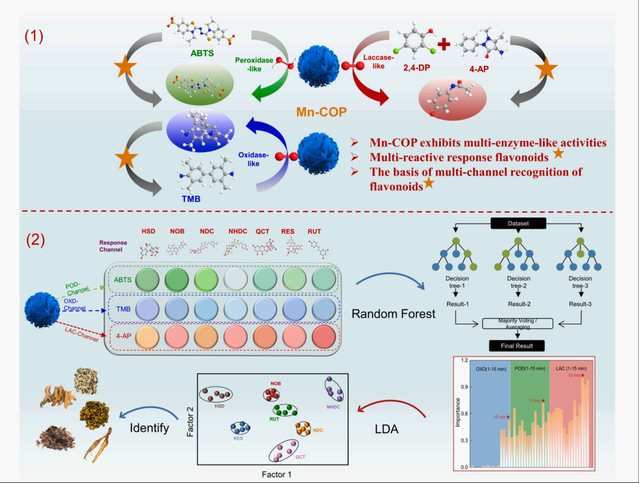 论文合成了一种新型三功能锰掺杂共价有机聚合物纳米酶(Mn-COP),该材料兼具类过氧化物酶、类氧化酶和类漆酶活性。类黄酮化合物因其强还原性可抑制Mn-COP的三重模拟酶活性,其抑制趋势随反应时间延长而增强。基于三种不同化学反应作为识别通道,Mn-COP构建的传感器阵列显著提升了检测准确性。为评估反应时间对特征值优化的影响,本研究采用随机森林算法进行解析。该纳米酶传感器阵列能有效区分多种类黄酮化合物。结合随机森林算法,实现了对多种中药中10 - 500 μM浓度范围内7种类黄酮物质的精准识别与含量预测。本研究的关键创新在于引入了更科学智能的特征值选择方法,为开发高性能纳米酶传感器阵列开辟了新途径。