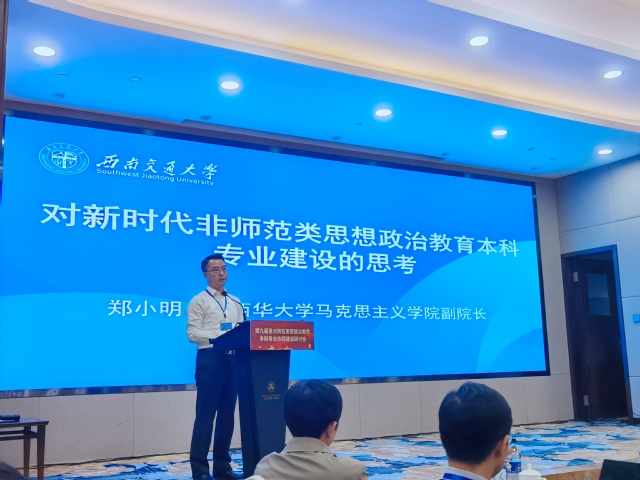 应大会组委会邀请,我校马克思主义学院副院长郑小明、教师何为参加本届研讨会。作为思想政治教育省一流本科专业校内负责人,郑小明在研讨会论坛上作了题为“对新时代非师范类思想政治教育本科专业建设的思考”的主题发言。他在主题发言中分析了当前思想政治教育专业建设中存在的问题,介绍了我校思想政治教育专业36年的发展历程和经验做法,从人才培养目标定位、课程体系构建、专业教材建设、专业建设评估考核等方面对新时代思想政治教育本科专业建设提出了对策和建议。郑小明的发言得到与会专家的好评,尤其是我校思想政治教育本科专业确定的“能说、会写、善思、明辨、慎行的有情怀的思政人”的培养目标引发了与会专家学者的热议,得到极大的认同。