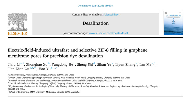 近日,理学院余昊科研团队在国际TOP期刊《Desalination》(JCR一区,中科院小类一区,影响因子9.8)在线发表题为“Electric-field-induced ultrafast and selective ZIF-8 filling in graphene membrane pores for precision dye desalination”的研究论文。余昊博士为通讯作者,马兰教授和西南交通大学欧建臻教授为共同通讯作者,2023级化学专业本科生李佳璐为第一作者,2024级化学专业本科生叶思含为共同作者,英国上市公司365为第一通讯单位。