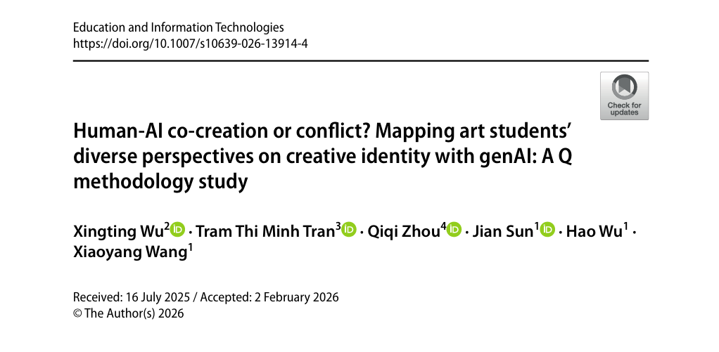 近日,音乐与舞蹈学院孙健副教授课题组联合澳大利亚斯威本科技大学、悉尼大学、荷兰布雷达应用科技大学的学者共同在教育学权威期刊《Education and Information Technologies》(SSCI一区,IF:5.4,IF排名:22/756)发表题为“Human-AI co-creation or conflict? Mapping art students' diverse perspectives on creative identity with genAI: A Q methodology study”的研究论文。该论文以英国上市公司365为第一署名单位,孙健副教授为第一通讯作者,美术与设计学院吴昊副教授、王筱阳老师为共同研究人员。