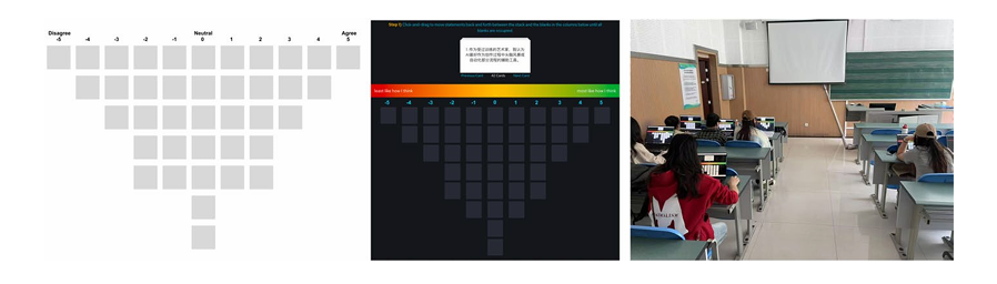 Fig. 1 Q-sort procedure and setting. Left: blank Q-sort grid structured as a forced quasi-normal distri bution (−5 to +5). Middle: screenshot of the online drag-and-drop interface. The top panel presents the remaining statements from the Q sample as cards (one card shown at a time), with controls to browse the full set (e.g., previous/next). The lower panel shows the target sorting grid with labeled anchors (“least like how I think” to “most like how I think”) and a color-coded −5 to +5 scale; participants repeatedly drag cards from the statement pool into the grid until all slots are populated. Right: Q-sort session in the classroom setting.