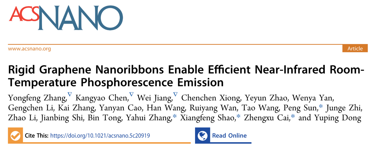 近日,理学院张亚会副教授课题组及合作者在国际学术期刊《ACS Nano》(中科院一区TOP,IF=16.0)发表题为“Rigid Graphene Nanoribbons Enable Efficient Near-Infrared Room-Temperature Phosphorescence Emission”的研究论文,张亚会副教授为该论文共同通讯作者,2024级硕士研究生陈康耀为该论文共同第一作者。