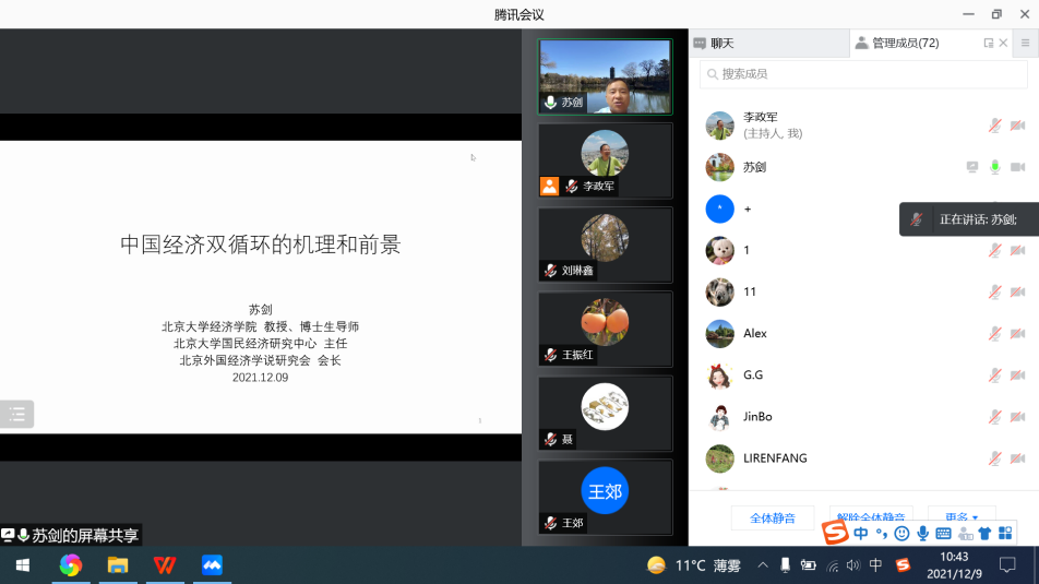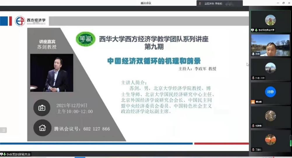 12月9日,应我校首席教授李政军邀请,北京大学经济学院教授、博士生导师苏剑在腾讯会议室,以《中国经济双循环的机理和前景》为题,给我校西方经济学教学团队成员作学术报告。学术报告会由李政军主持,我校西方经济学教学团队成员、经济学院和管理学院部分研究生、以及来自华侨大学、四川外国语大学、山东理工大学、云南大学、湖北民族大学和西南科技大学等数十所高校的教师参加报告会。